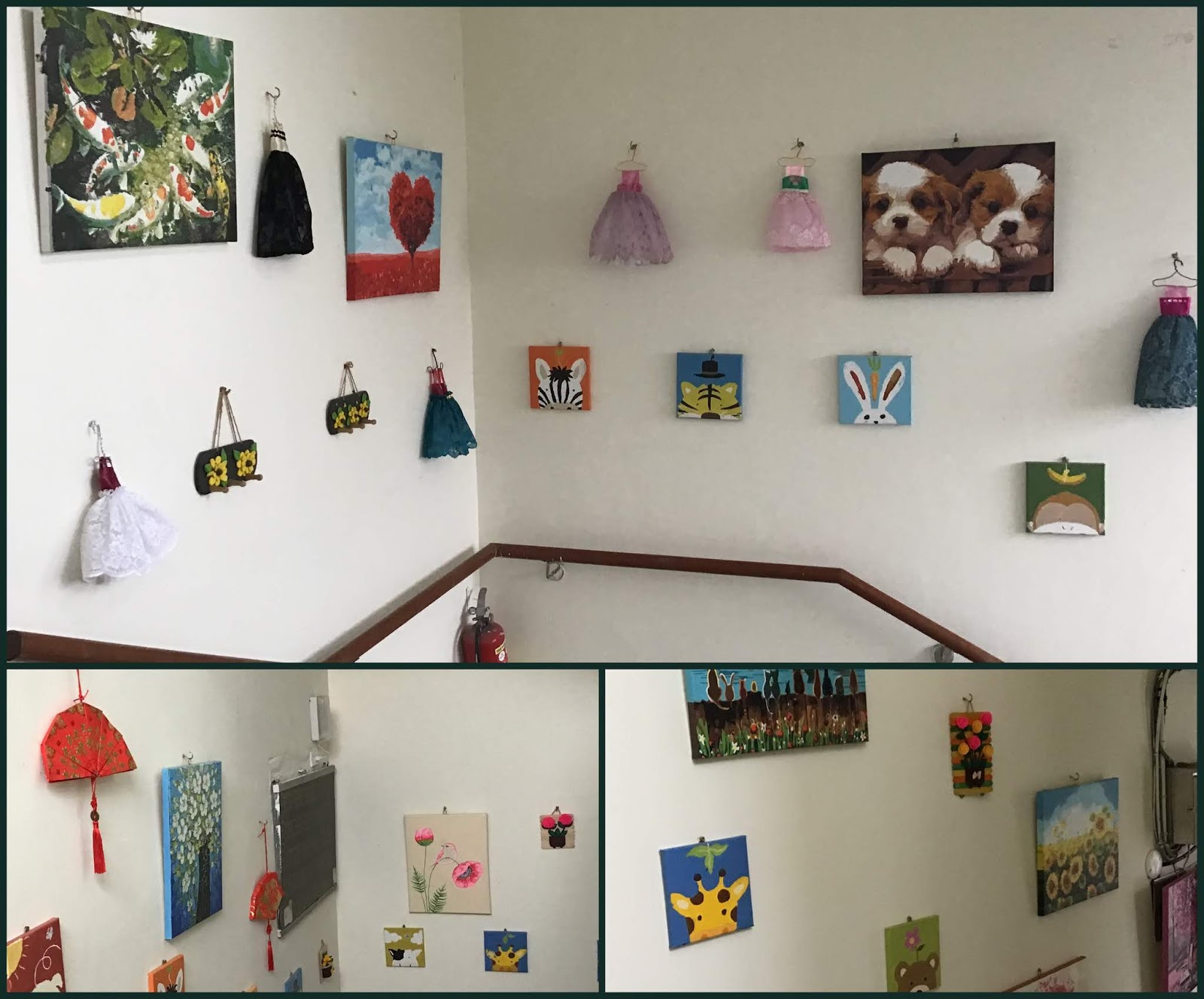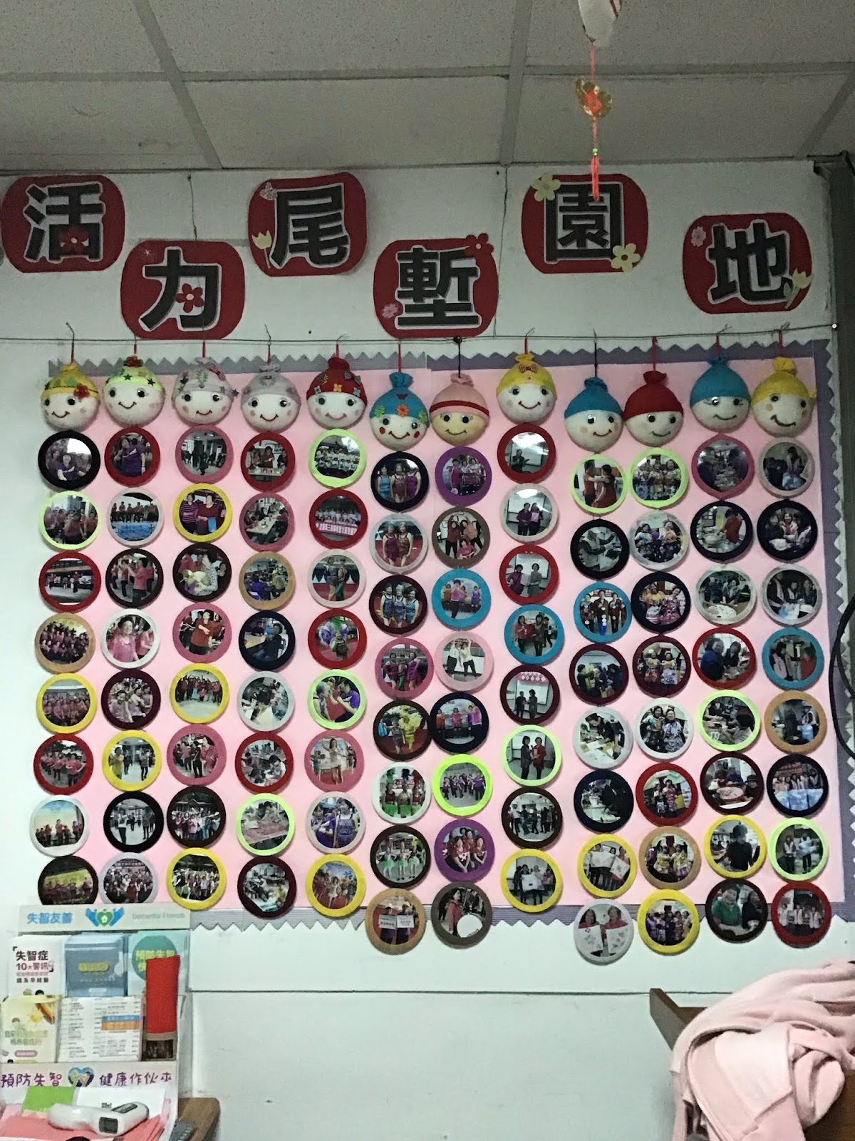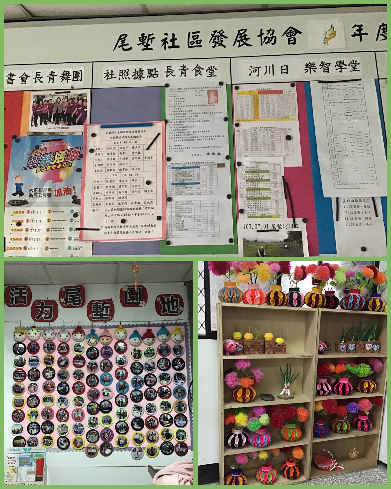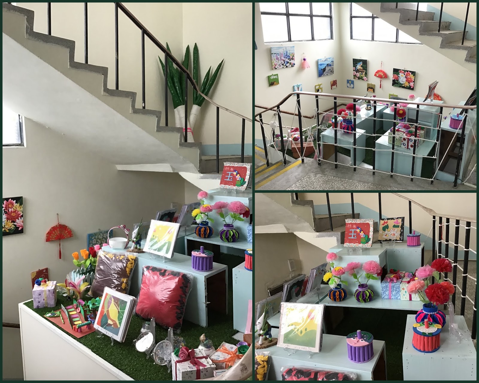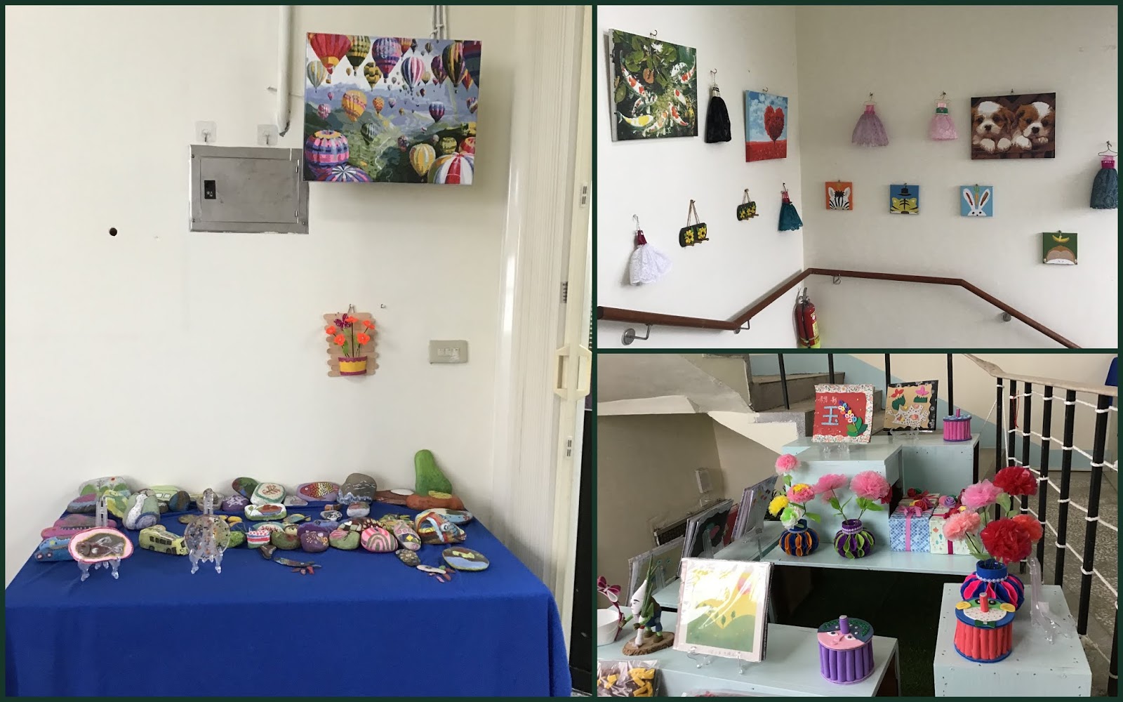 志工將社區學員們的精巧手工藝,分門別類地擺放 陳設在活動中心的各個樓層、轉角、牆面,不但