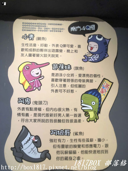 描繪著「南方澳漁港」意象最具代表性的鬼頭刀、鯖魚、鯊魚黃鰭鮪魚、珊瑚礁等。