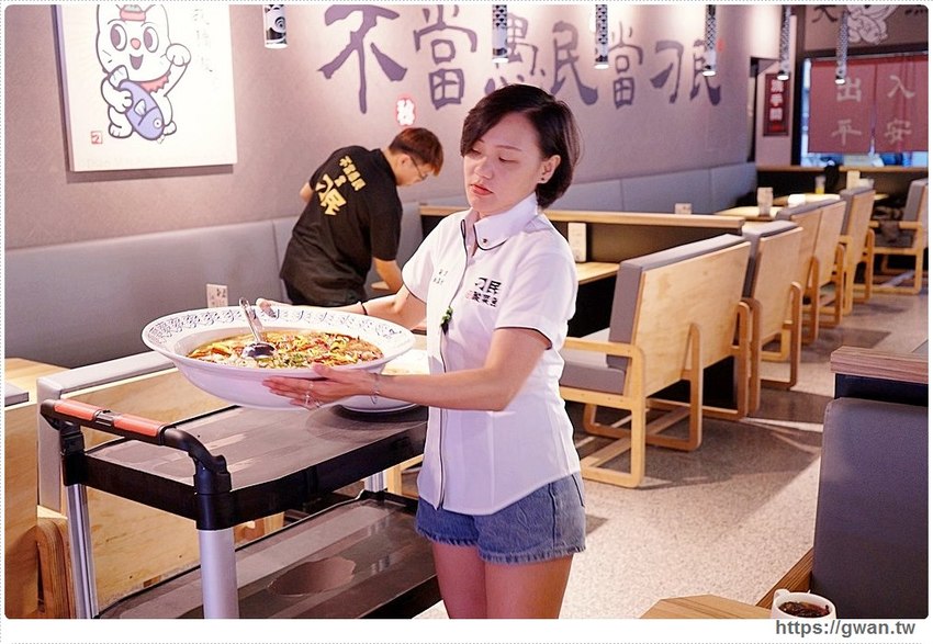 餐點做好後,店員會用餐車推出,上桌前還會全店一起喊出『不當愚民當刁民』的Slogan,你們可以看前面影片,感覺超有活力的!