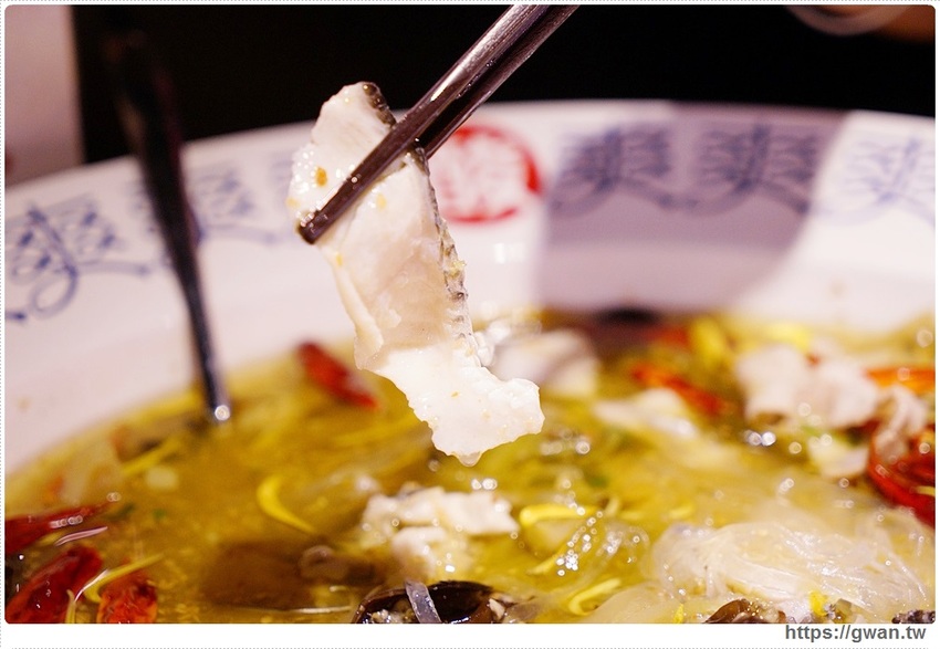 鍋底會放一些寬冬粉,加上酸菜魚的湯底,接著倒入川燙過的烏鱧魚片,鋪得滿滿份量非常多