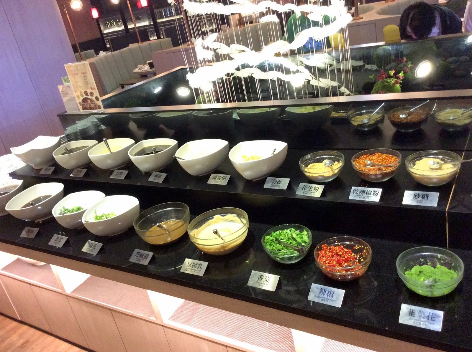 餐檯前擺滿了各式醬料和辛香料,難得火鍋店有備韭菜花醬泥、