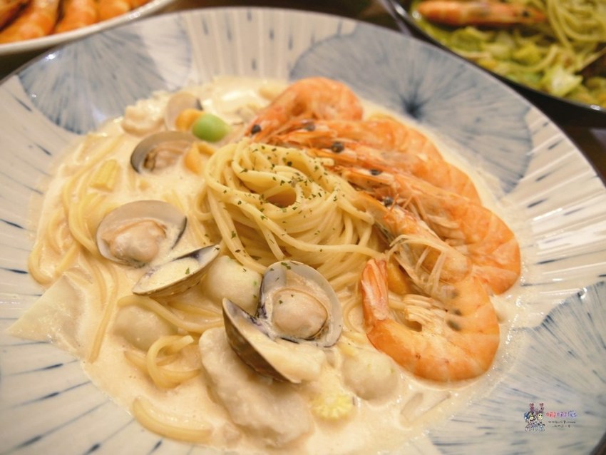 青醬則是阿寶一直以來吃義大利麵的必點款,我們今天點的是海陸總匯義大利麵。