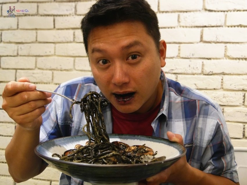 我點的是辣味墨魚汁海膽海鮮義大利麵,平常看到黑黑的食物都會覺得有點奇怪,唯獨麵包和義大利麵這兩種食物,用黑黑的就忍不住想點一下。