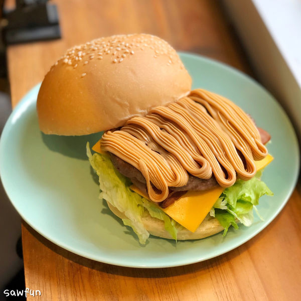 擠上滿滿的花生醬搭配重口味培根和厚實多汁的漢堡排✨
