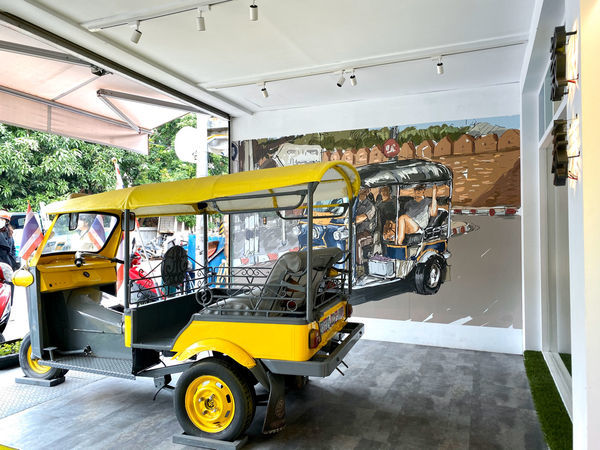 鵝黃色系為主軸的裝潢,門口有台嘟嘟車很好認,後面的手繪牆也很好拍照哦!