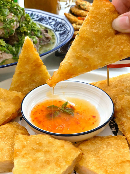 ▫️ 月亮蝦餅的厚度很有誠意,煎的金黃上桌,皮脆餡鮮,蝦泥口感有彈性,每口都能咬到蝦仁塊的真材實料。
