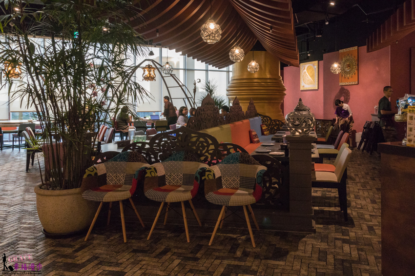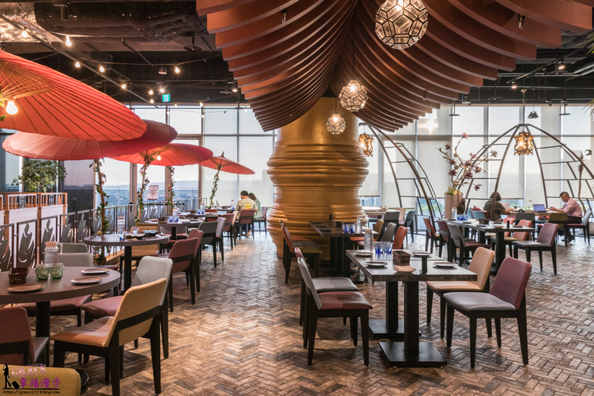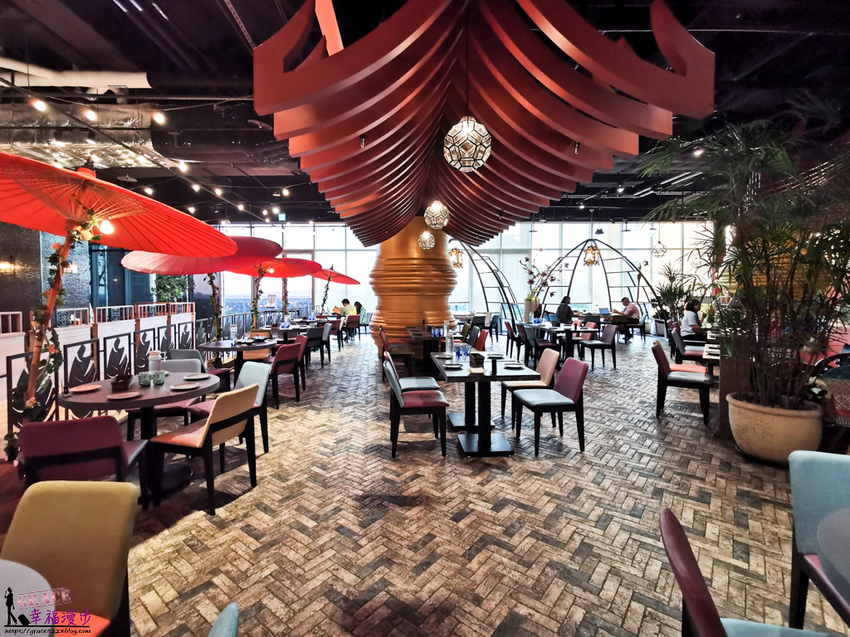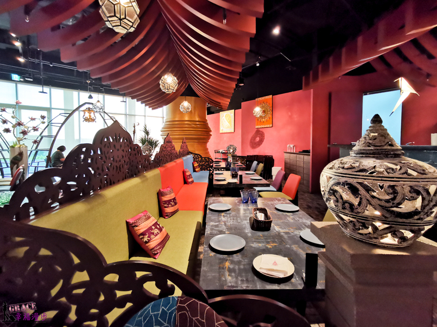餐廳內的裝潢設計也挺有巧思,以金色的圓柱搭配朱紅的屋簷造型,另一側是用紅色的油紙傘,呈現泰國皇室金碧輝煌的氛圍。