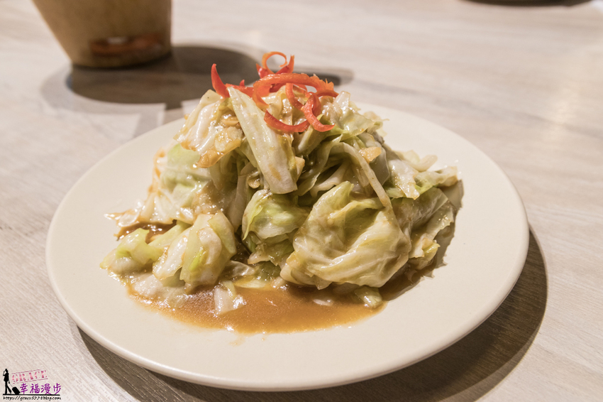 泰味高麗菜,高麗菜與泰式醬料一起拌炒,高麗菜清脆鮮很符合大人、小孩的口味喔!