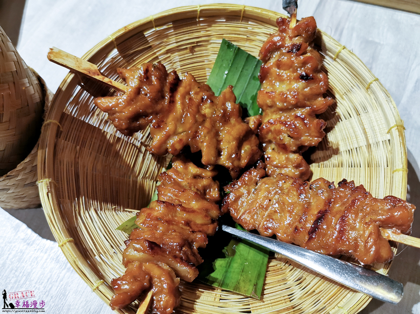 據說在泰國有許多地方的母併因為製作繁瑣,有些都改成用絞肉壓製成塊做成烤肉串,阿杜主廚堅持要一層肥肉和一層瘦肉手工串製,再刷上泰國進口的醬料細火慢烤,光是看就讓人垂涎欲滴。