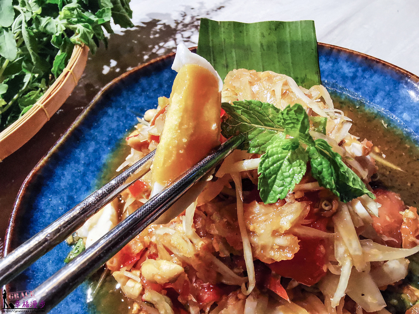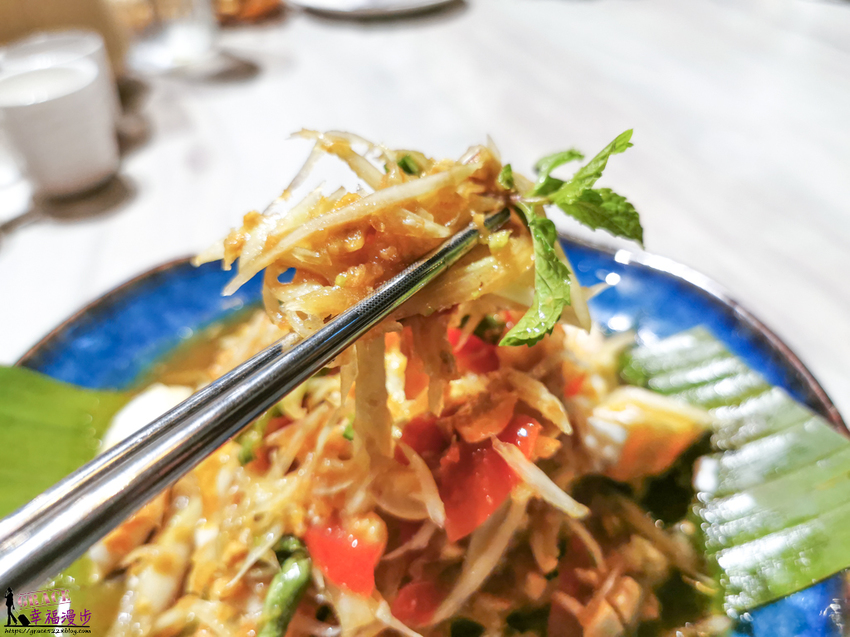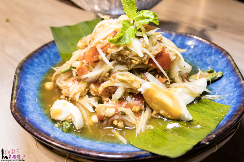 涼拌青木瓜,將青木瓜切絲後搭配主廚特調的青木瓜醬,搭配蕃茄、鹹蛋等等,最後再淋上新鮮檸檬汁提味,這道料理最適合夏天食用了。