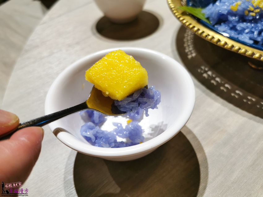 芒果糯米飯,季節限定的甜品,採用台灣的愛文芒果和泰國進口糯米,品嚐的時候先把椰漿和糯米飯拌勻,再搭上愛文芒果一起入口, 最後再吃上一口芒果冰淇淋, 整個風味超迷人啊!