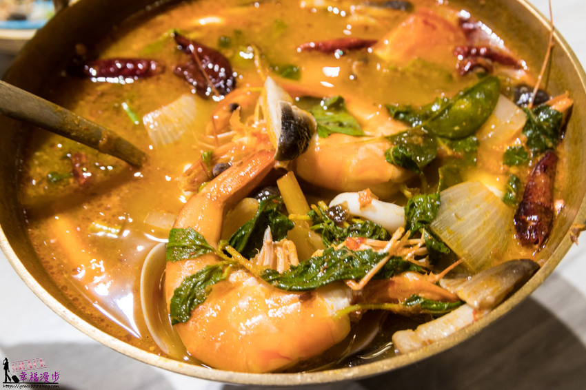 伯DAY海鮮湯,是採用南薑、香茅、檸檬葉和大骨熬煮的高湯,搭配蝦子、花枝和蕈菇整個食材相當豐富,再加入阿杜主廚特製的酸辣海鮮醬還有打拋葉,整個湯頭喝起來很有層次感,這道海鮮湯喝起起來不會太過酸辣,多了打拋葉更有著清爽感,看似濃郁的湯頭喝起來卻不負擔。