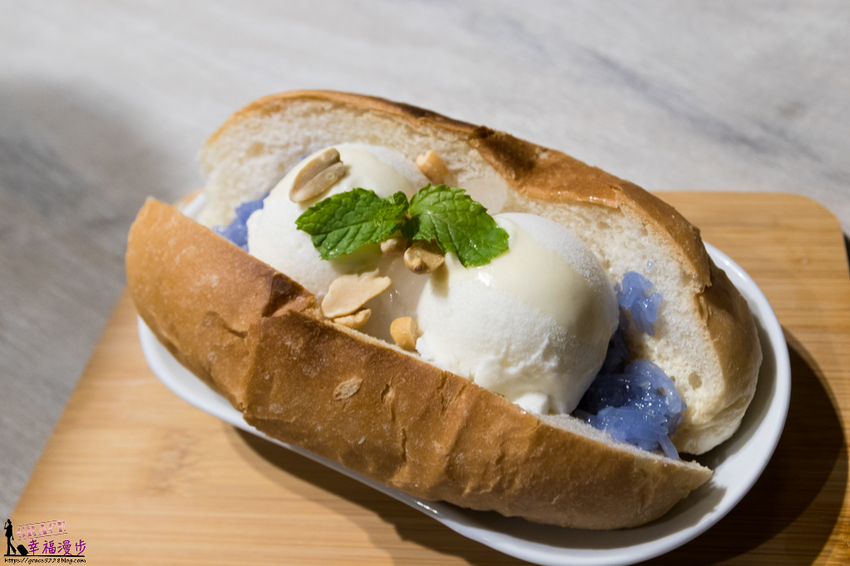 麵包冰淇淋,有著椰漿糯米飯、椰奶冰淇淋、亞達子和花生米,一口咬下奶香氣十足,冰淇淋有著乳化效果,讓麵包帶點濕潤更好入口,吃起來相當有飽足感。