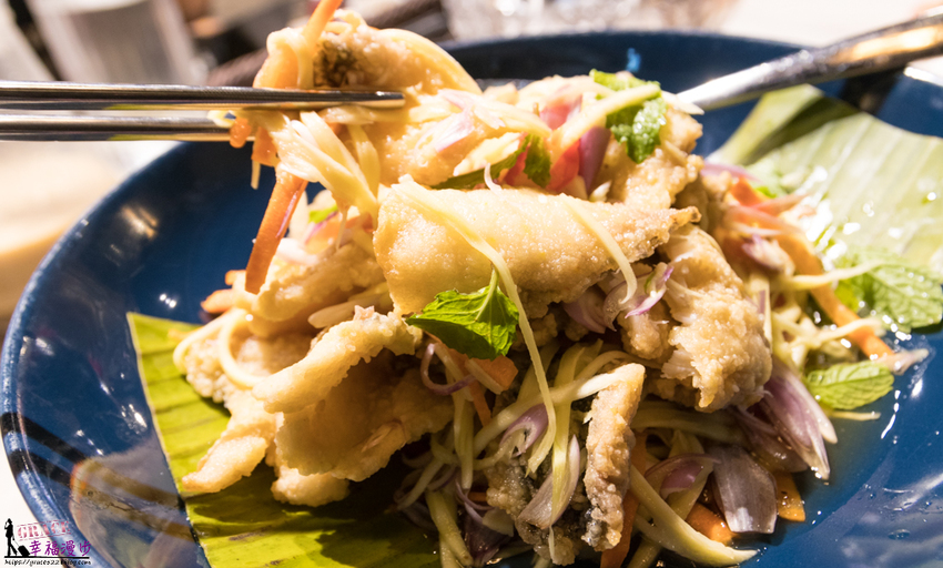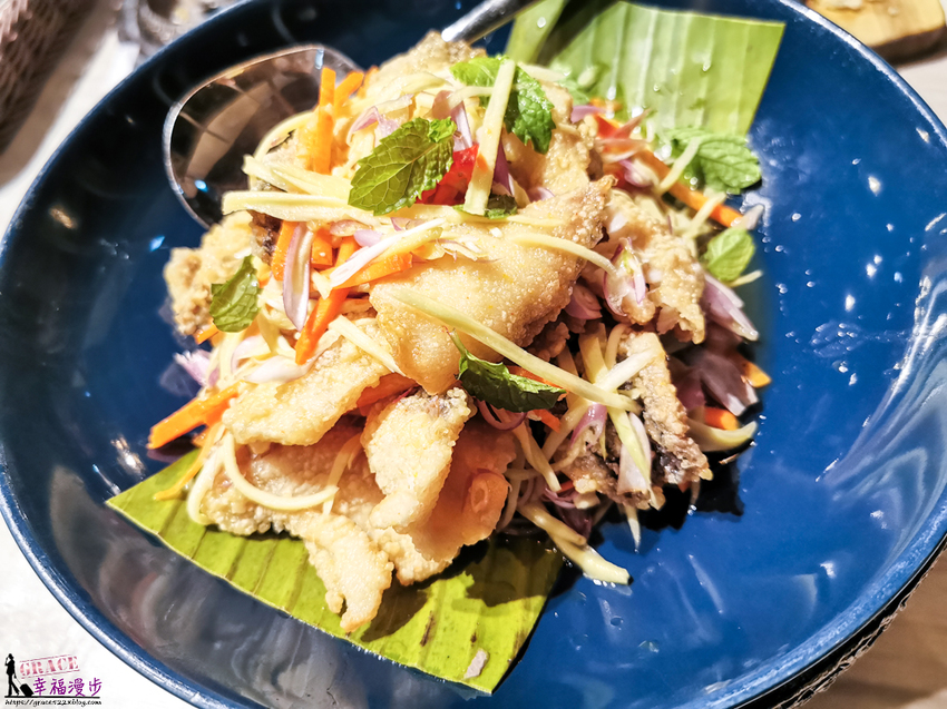 芒果炸魚,青芒果絲與酥炸魚片搭配的一道夏季清爽料理,在阿杜用餐連視覺都是一種饗宴,使用的容器都相當別緻、華麗。
