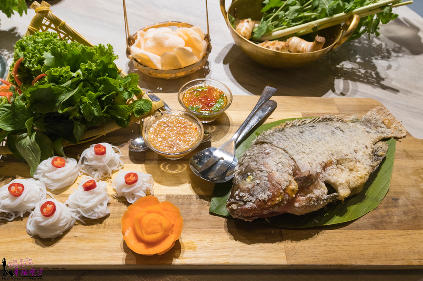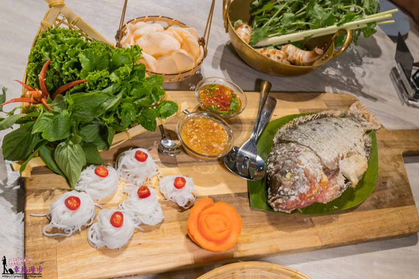 是將國宴魚台灣鯛沾滿海鹽後去烤熟,搭配一旁的生菜、米線和醬汁一起入口食用,醬汁一種是有加花生另一種是有辣度,依個人喜好去調味。