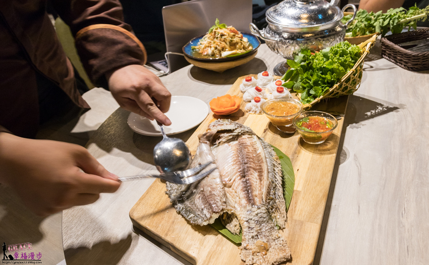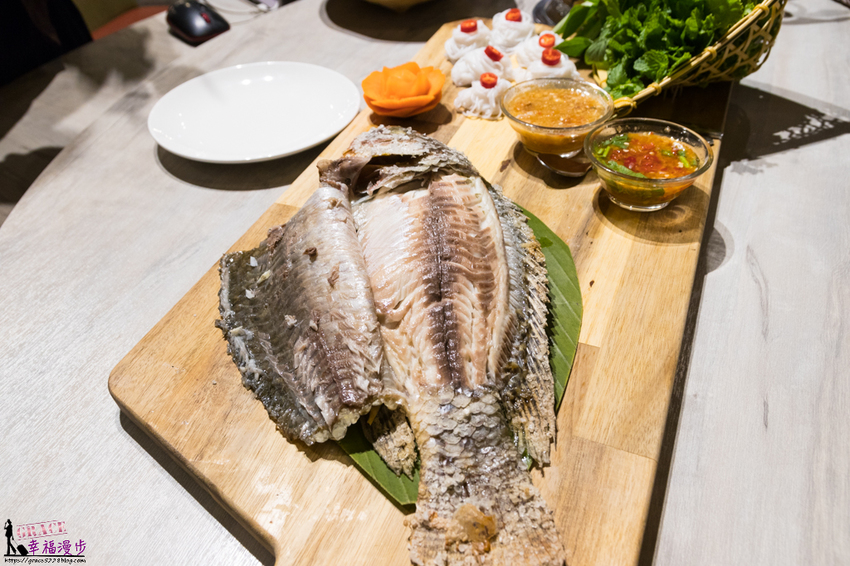 魚肉取下後先拿一片生菜葉、放上米線、選擇香料葉看是喜歡九層塔還是薄荷葉任你搭配,再放上魚肉淋上醬汁,一起入口品嚐,天啊!也太美味了,生菜的清甜、香料葉引領出魚肉的鮮美、米線又滑口,整個味道超豐富的,超愛這一道料理啊!