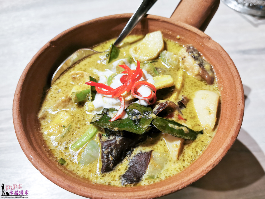 綠咖哩時蔬,將泰國綠辣椒的子去掉,用綠辣椒去熬煮出綠咖哩醬汁,再搭配木耳、杏鮑菇、四季豆、玉米筍、綠花椰菜等等一起去熬煮,再加入椰奶去增加香氣,時蔬的本身的甜味與咖哩的辛香氣刺激著味蕾,辣度是溫順更適合台灣人的口味。