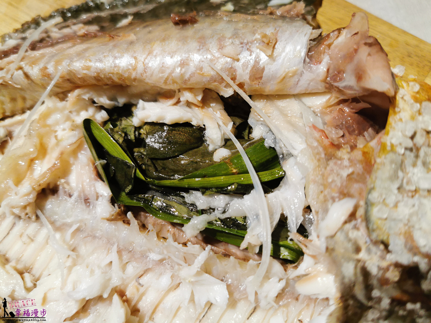 國宴魚除了沾海鹽去烤肚子裡也放有香料葉,趁著熱度將魚肉取下時陣陣的香料味撲鼻而來。