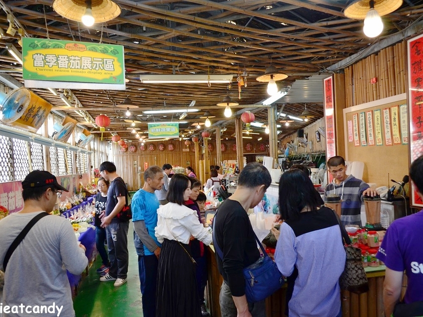 一進門就看到農產品販售區,有現打的番茄汁、採好的各式各樣番茄、甜椒,可以秤重、也能盒裝賣,種類還挺多的。