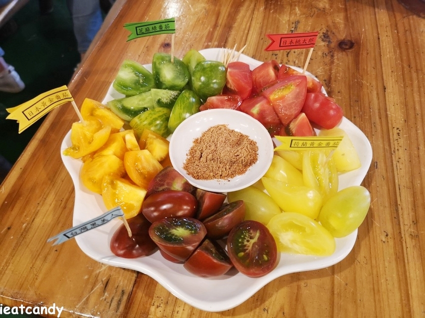 點了一盤色彩繽紛的番茄拼盤,搭配梅粉,有些爽口、有些偏軟、有些脆口、有些則甜味濃郁,滋味都很不同~但重點都還不錯。