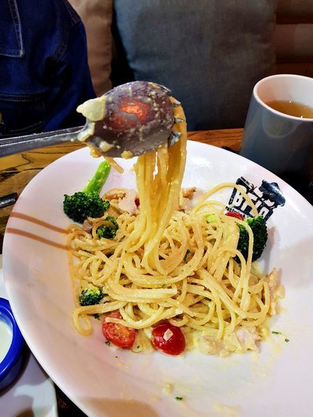 拌開之後, 義大利麵混著散蛋, 整體麵體充滿了蛋香! 白醬吃起來不會很膩, 猜是有蛋來做了一個綜合