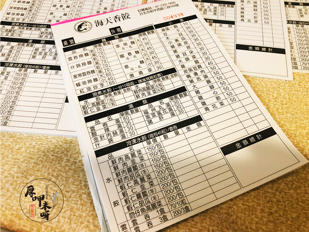 海天香餃就店名來看,就知道是一家以水餃為主打的店家,冷凍水餃備有9種口味,現場內用則只有提供最招牌的蝦仁高麗菜水餃、蝦仁韭菜水餃、鮮肉高麗菜水餃、鮮肉韭菜水餃,也讓不愛韭菜的人可以選擇,通常我也都是吃這幾種,倒也還沒買過其他口味,也許就是定期一段時間才來一趟,但每次吃都還是覺得好吃。