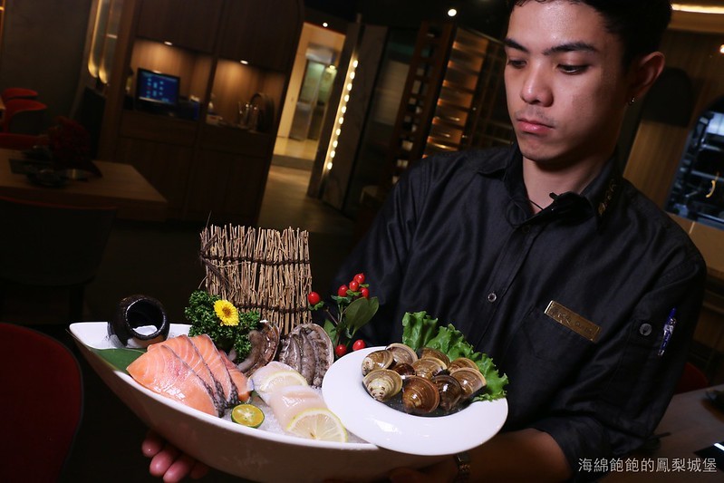 海鮮拼盤內有九孔鮑、日本生食級干貝、挪威鮭魚、台灣文蛤