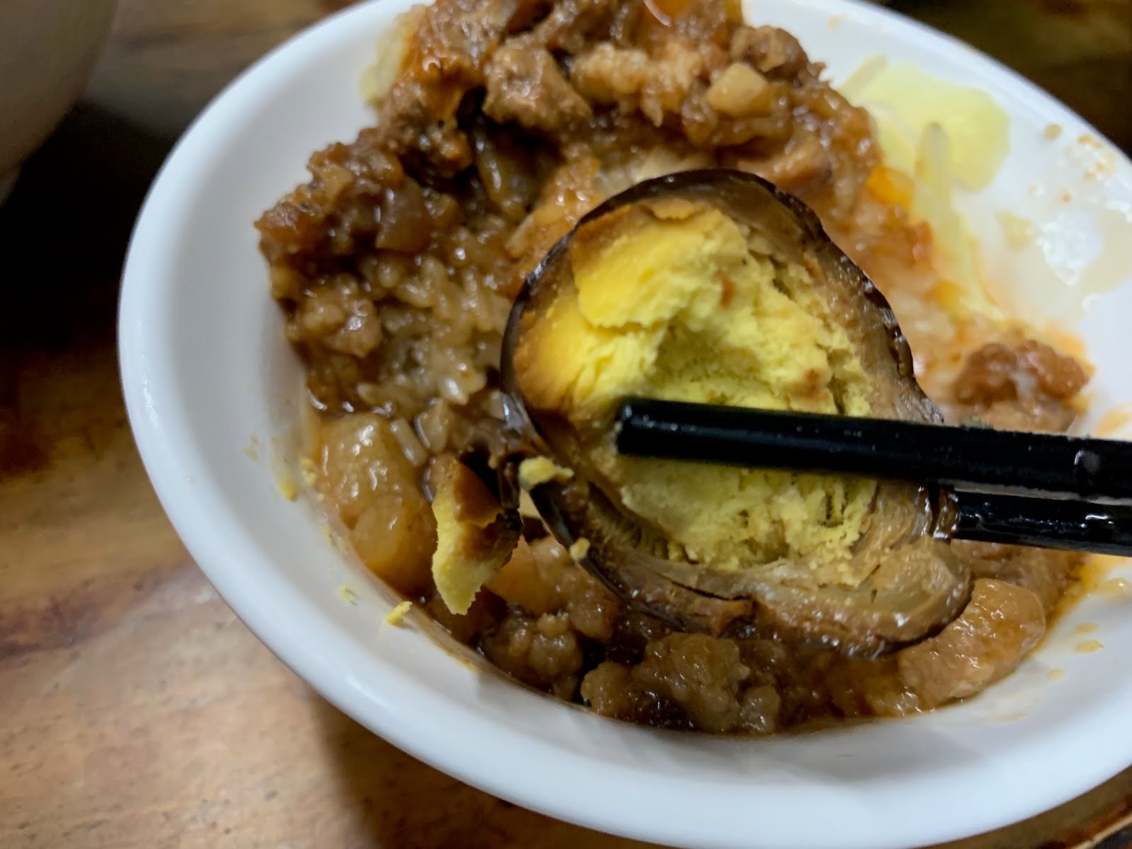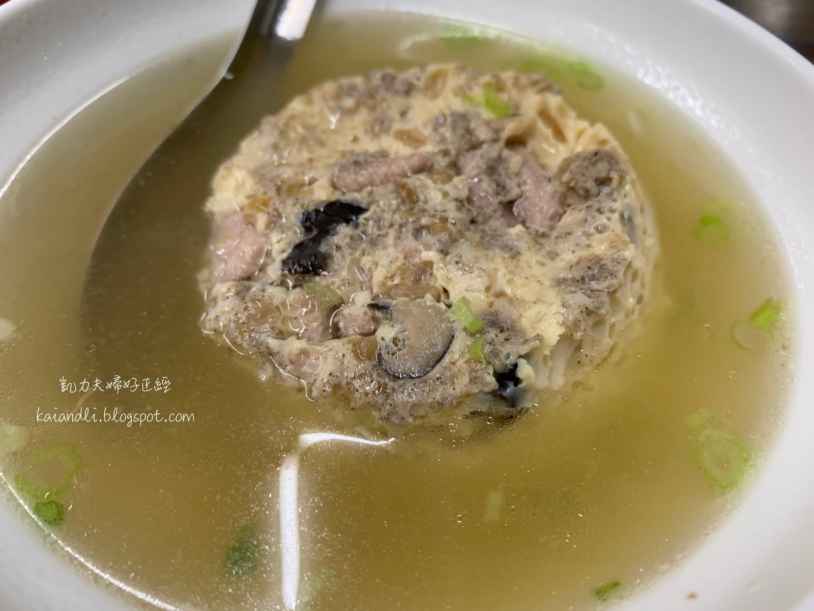 最後一道介紹,但也是非常有特色的一道:蒸蛋湯。在台灣很少在小吃店看到這道。應該是說,到目前為止我還沒看過有別家。一樣放在筒仔裡面炊熟的蒸蛋,把食材的湯汁緊緊鎖在裡面,一放進高湯中,香菇清香搭配豬肉嫩汁,渾然天成一道相當好喝的湯品。