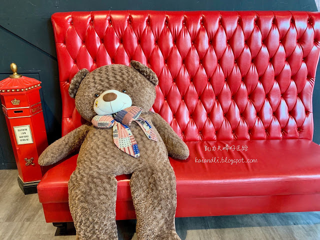 慵懶的大熊,躺在純紅色的沙發椅上,顯得相當慵懶愜意。這適合這間餐廳的氣氛呢。