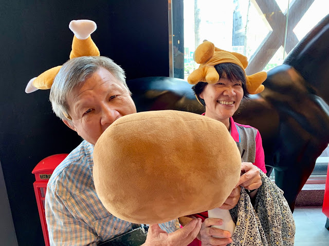 既然是網紅必來的餐廳,一定要有滿滿的拍照道具。店家算是準備得非常用心,有打卡版、雞腿造型的頭箍。凱伊凡邀請爸爸媽媽當起網紅MD,雖然凱爸看起來非常不甘願。
