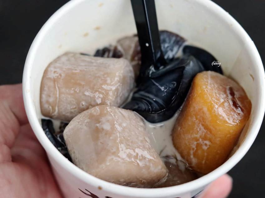 帶Q勁的芋圓、地瓜圓,與咕溜滑順的仙草非常地契合,而且可能因為沒有泡在熱湯裡,那嚼勁更是明顯,真是好拍又好吃啊!