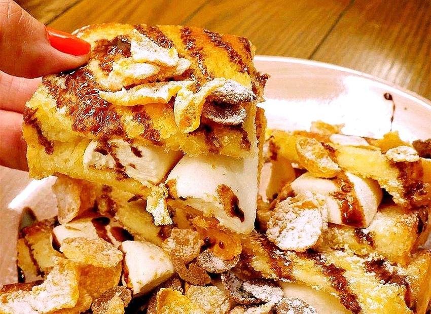 剛烤出爐的吐司.裡面夾入棉花糖.再淋上巧克力醬,還有脆口的麥片與彩球.外層酥脆脆,裡面軟綿綿的,大人小孩都喜愛這一味