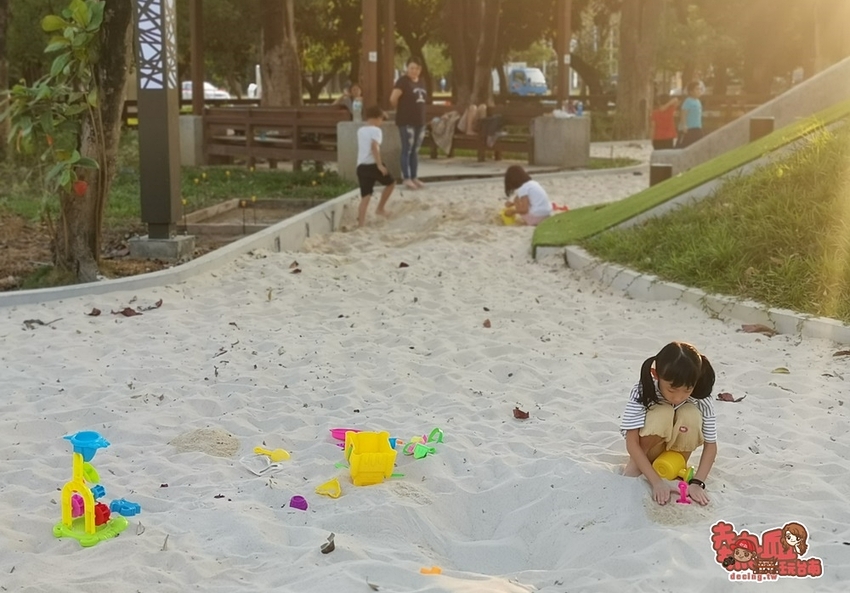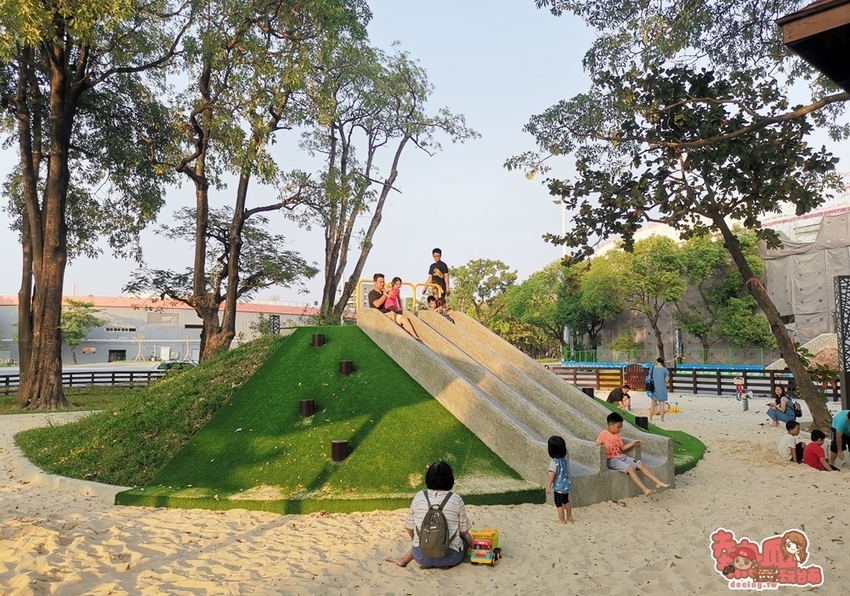 沙坑場區真的很大,裡面有人工設計的小山丘,一旁還有涼亭,可見很多人帶著小孩入內玩耍,從小山丘上滑下來,高度適中好玩又有趣。