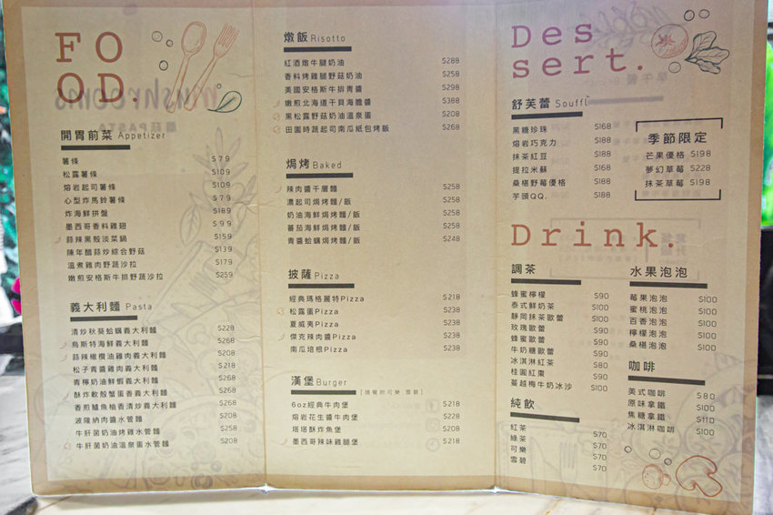 蘑菇Pasta的餐點頗為多元化,像是炸物、沙拉、義大利麵、燉飯、焗烤、披薩、漢堡等,還有總是洗版的舒芙蕾與各式飲品,店內無收取服務費,低消100元。