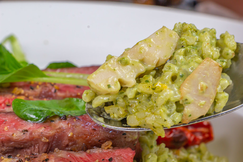 美國安格斯牛排青醬燉飯,五、六分熟的粉色牛排與綠色的青醬很是對比。