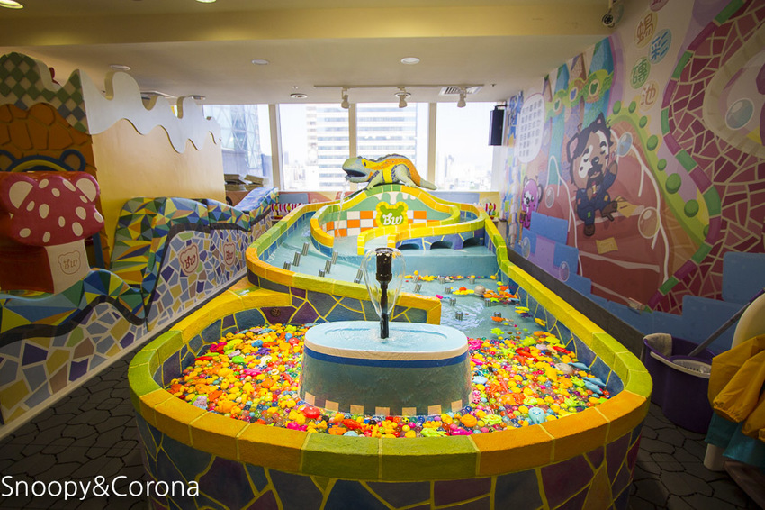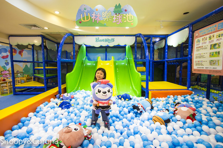 黃綠色滑梯搭配藍白色的球池,球池內還有好多熊星人陪伴,