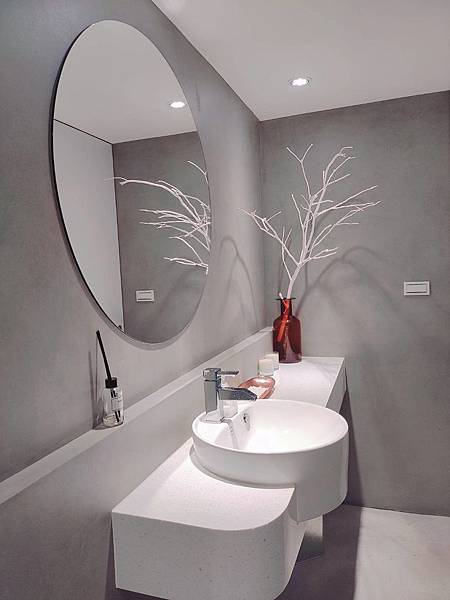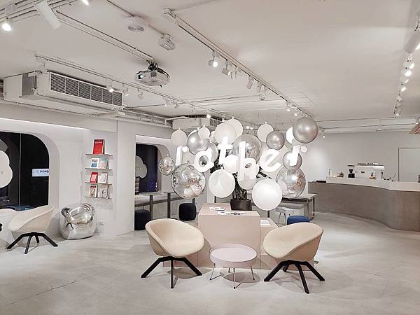 店內裝潢採用淺色的石材、霧銀、微粉色水泥牆裝潢。