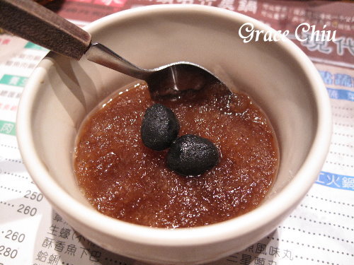 近期附餐推出了多種選擇,但我始終都是選手工拉麵或冬粉,餐後會送上一小杯酸梅冰沙,裡頭還放了二顆竹碳花生,很妙的搭配.