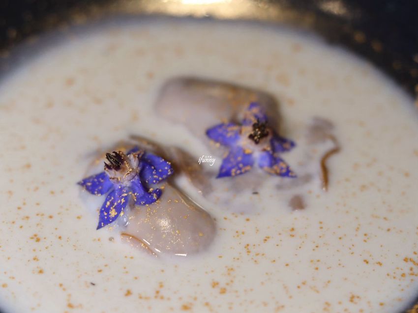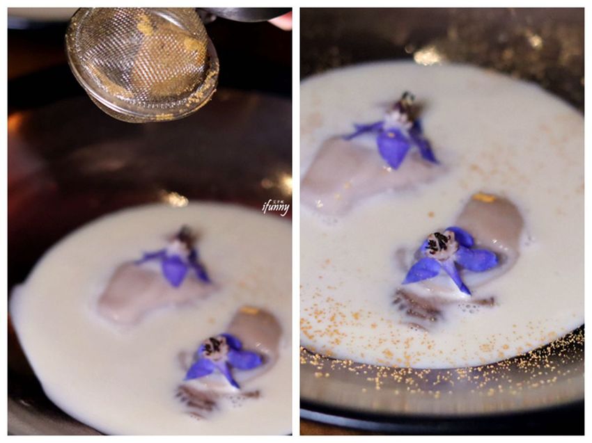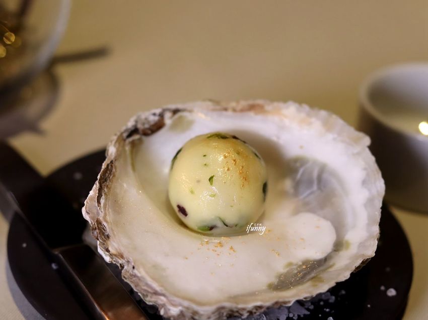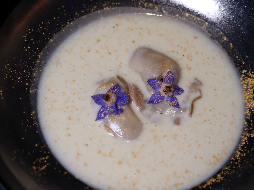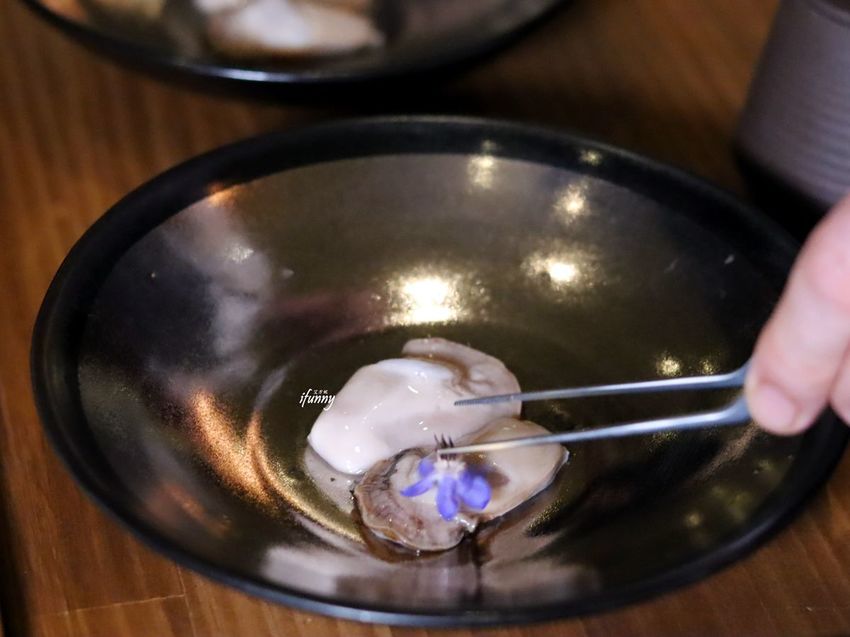 以法國三大名蠔之一的貝隆蠔放置在蒸籠之中,淋上舉世聞名的汝拉黃酒煙燻,取出後飾以食用花。