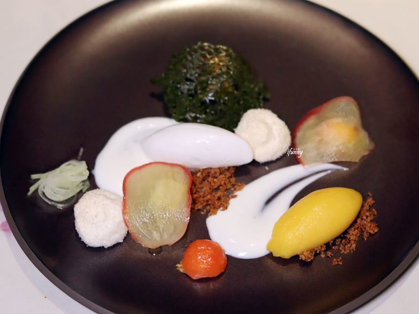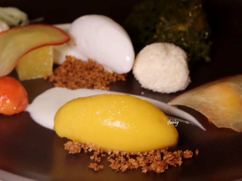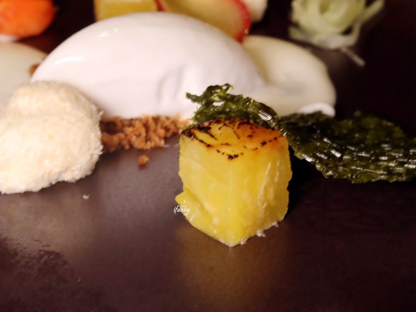 鳳梨的部份,以原味及炙燒過來表現不同的風味。這道展現台灣水果不同於一般的面貌,非常有趣也很美味。