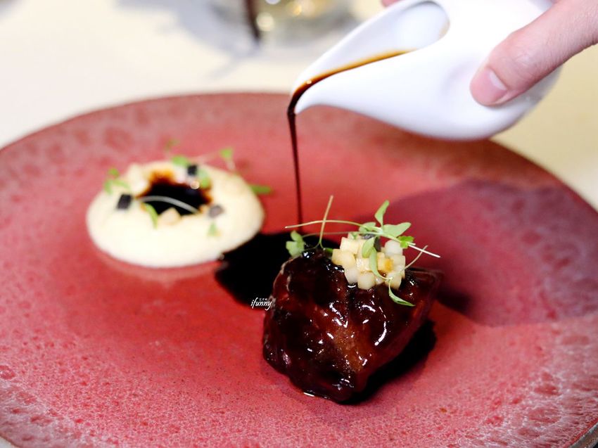 牛頰肉的肉質遍佈透明的筋絡,由於咀嚼時臉頰大量運動,造就其Q彈帶勁的口感。經由長時間的燉煮,筋絡化成豐厚的膠原蛋白,刀子幾乎是不需用力就可輕易劃開,入口的軟嫩程度超乎一般,感受到這小牛頰是被用心照顧了三天,是費時的功夫菜。