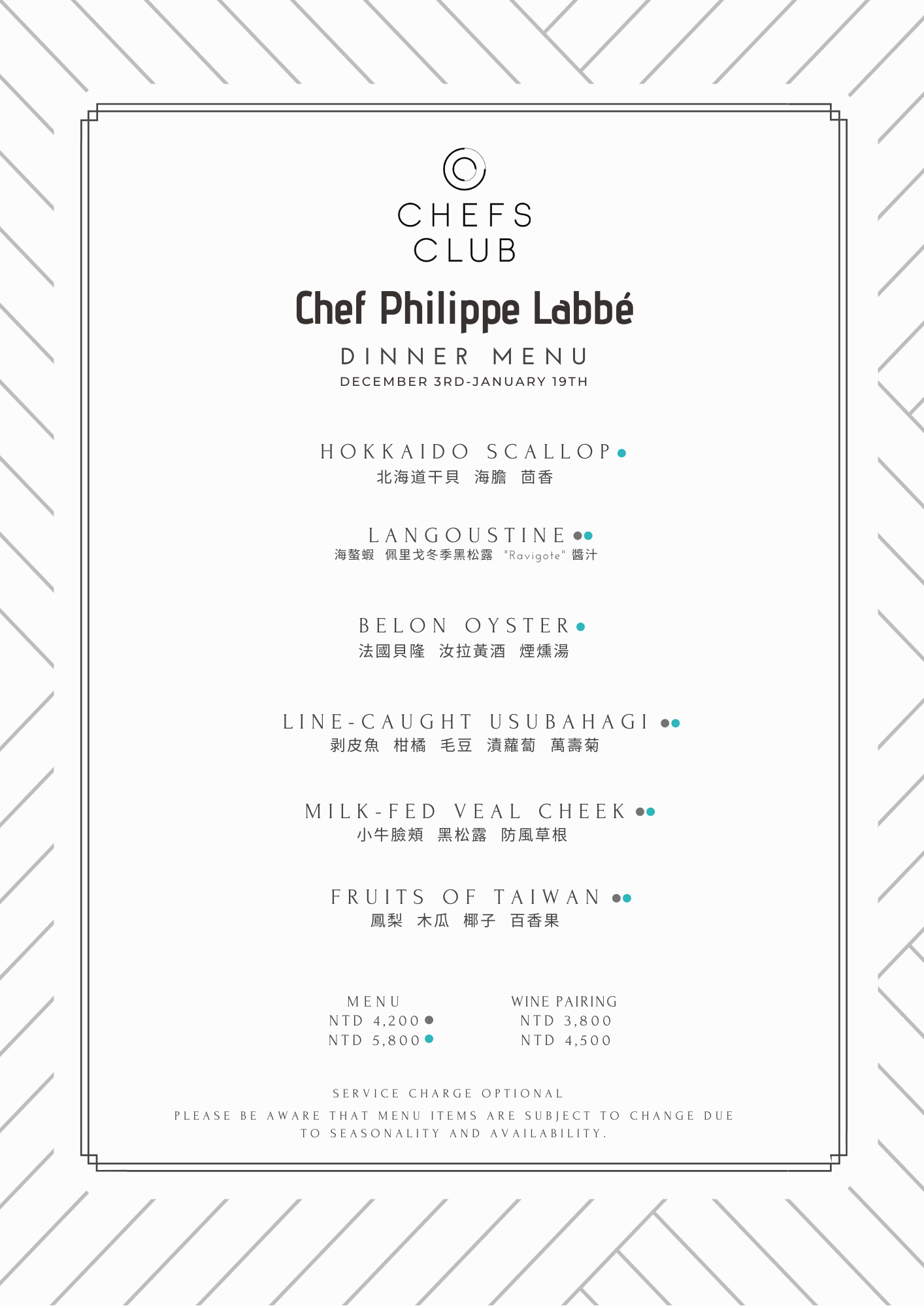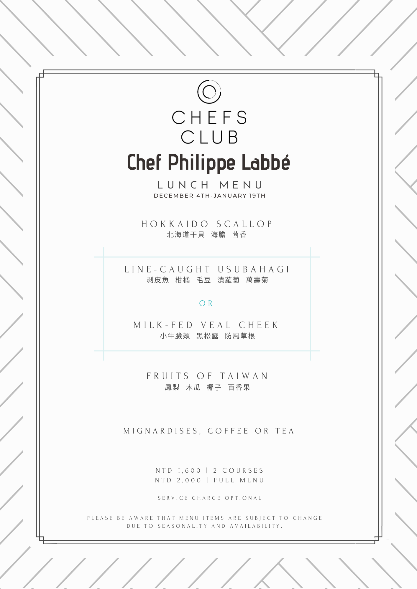 Chef Philippe Labbé被譽為「法國年度最佳大廚(Cuisiner de l’année)」的國寶級大師,在台北客座的時間為2019/12/3-2020/1/19。