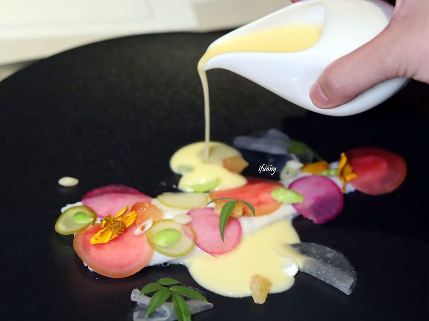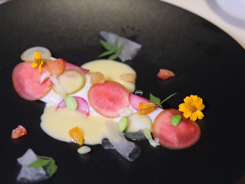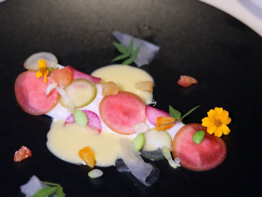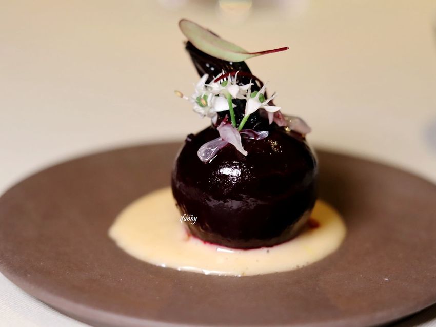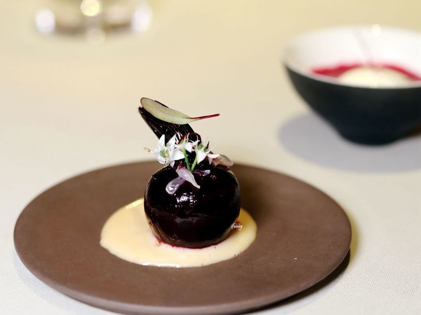 鹽烤甜菜根,底下的醬汁是搭配魚卵及鮭魚卵混美乃滋而成,飾以食用花,小巧精緻。