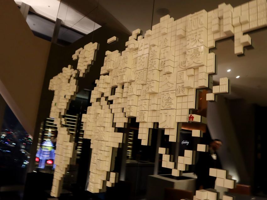 這包廂的牆上以積木堆積出世界地圖,積木上以中文寫上台灣各式小吃及餐點,而其中彩色的三個字,正分別代表Chefs Club在世界據點的三大城市。