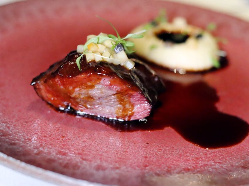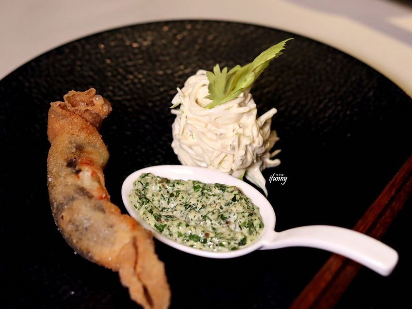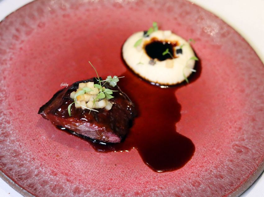 海螫蝦先抹上了黑松露再裹上麵皮去酥炸,這很像台灣以餛飩皮做外皮酥炸的料理。後方很像吃牛肉麵會搭的白干絲,其實是芹菜根與青蘋果製成的沙拉。中間的部份是結合黑松露製成的塔塔醬。炸物搭配塔塔醬本來就絕配,多了松露增添奢華的滋味。最後酸度明顯的青蘋果沙拉,中和炸物的油膩及濃郁,口腔最後達到一個清爽的平衡。