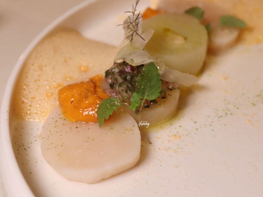 採用北海道干貝沒有斷筋,因此吃來特別脆甜,搭上一旁的馬糞海膽,醬汁也是海膽製成,搭配一起入口整個鮮甜更上了一層次。