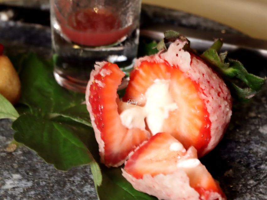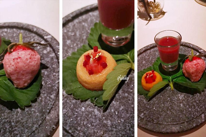 最後送上不在菜單內的甜點-草莓盤。以甘露醇製成薄薄糖皮包覆新鮮草莓,彷彿被白雪覆蓋其上。費南雪搭配的是草莓丁及覆盆子丁,飲品則是草莓及檸檬汁調製而成。