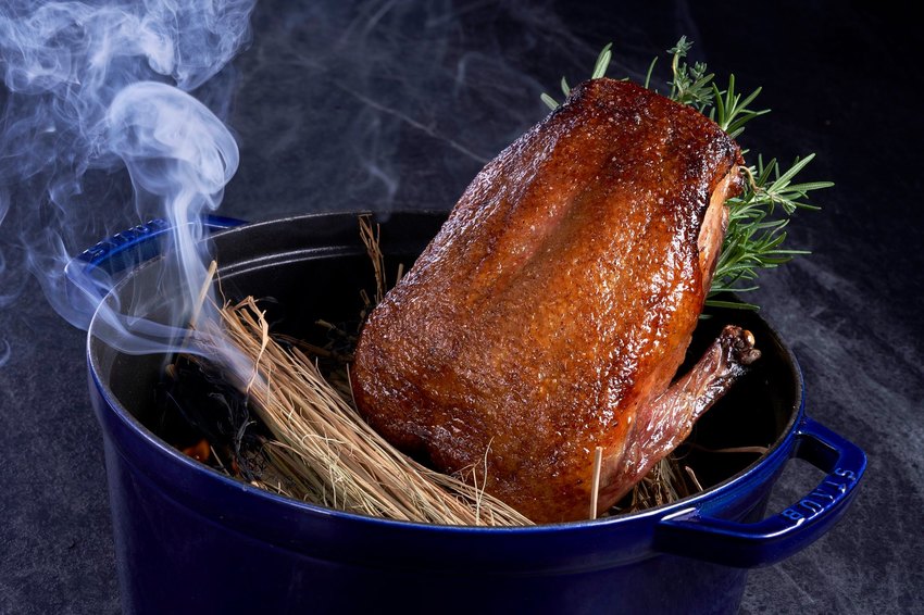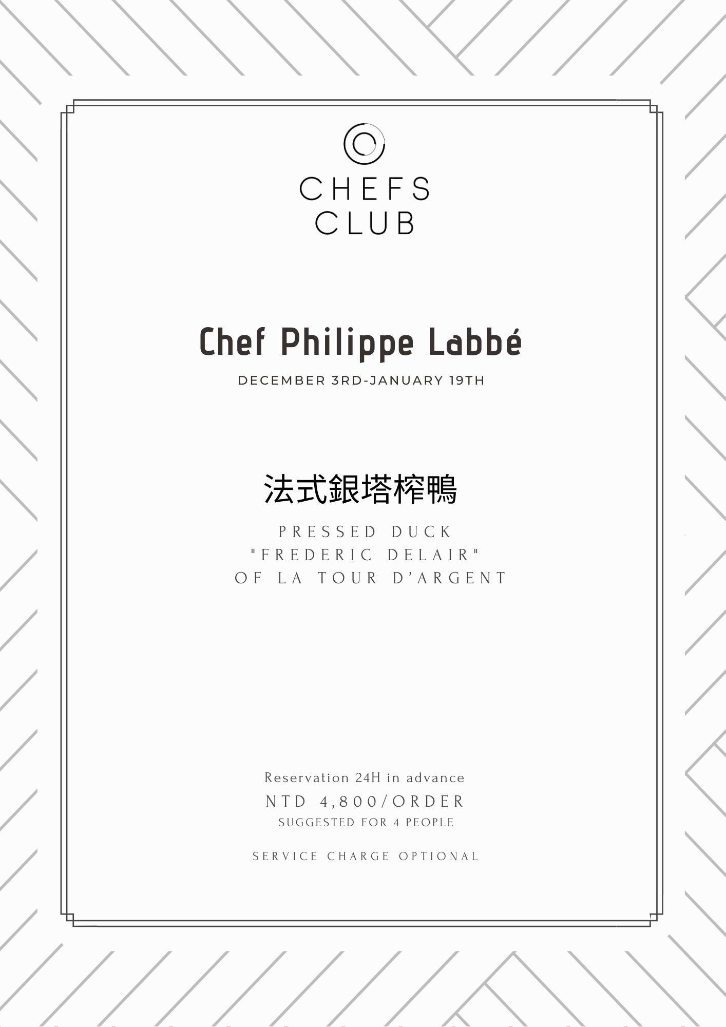 隨著他跨海而來的是一道傳承自1892年的名菜:法式銀塔榨鴨,又稱血鴨(Pressed Duck,又名Le Caneton Frédéric Delair)。法式銀塔榨鴨其特色之處在於以榨鴨機將12隻鴨骨架所逼出的鴨血與精華汁液 製作成醬汁,再搭配熟成且煙燻烤過的胭脂鴨(在Chefs Club Taipei 所使用的鴨肉品種),品嘗時是以軟嫩的鴨肉搭配蘊含肉香的濃郁醬汁,讓人回味不已。