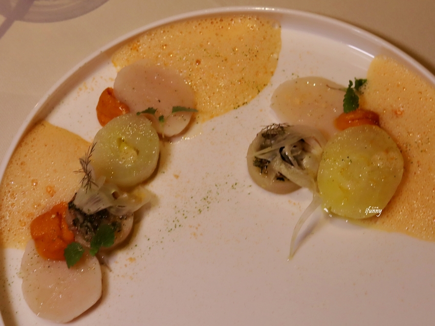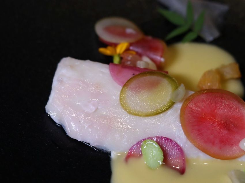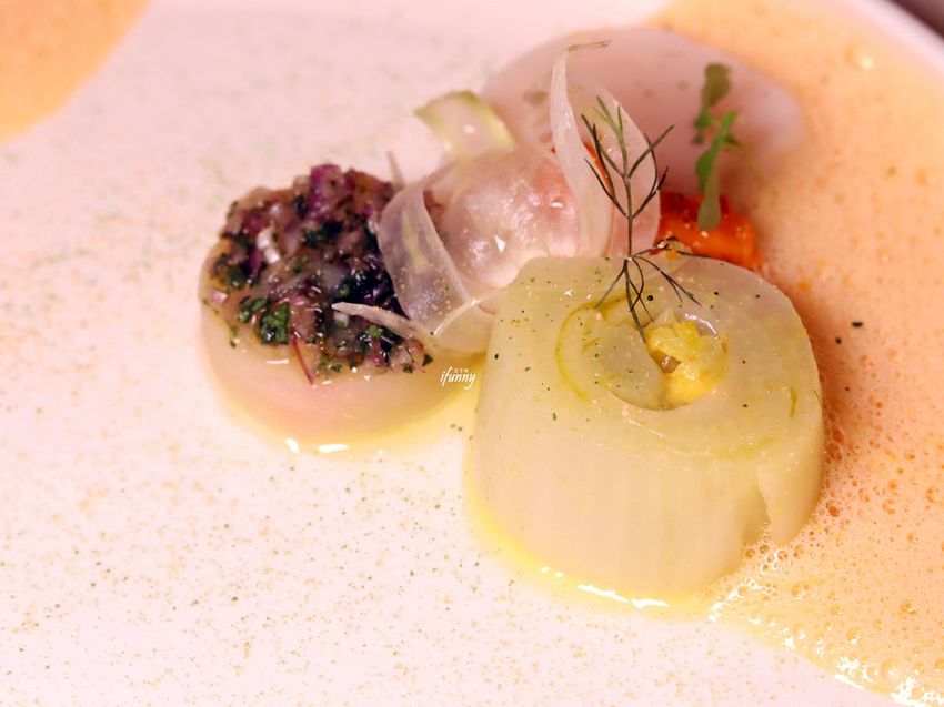 右邊長得很像洋蔥的是茴香, 其實一般常見的茴香籽或莖葉,原來茴香根也是可以食用的,吃來是比洋蔥還要清甜的滋味。後方是馬鈴薯切片放上了龍蒿製成的醬汁。龍蒿是歐美國家普遍使用的香草植物,香氣甜蜜且濃郁,賦予馬鈴薯不一樣的風味。