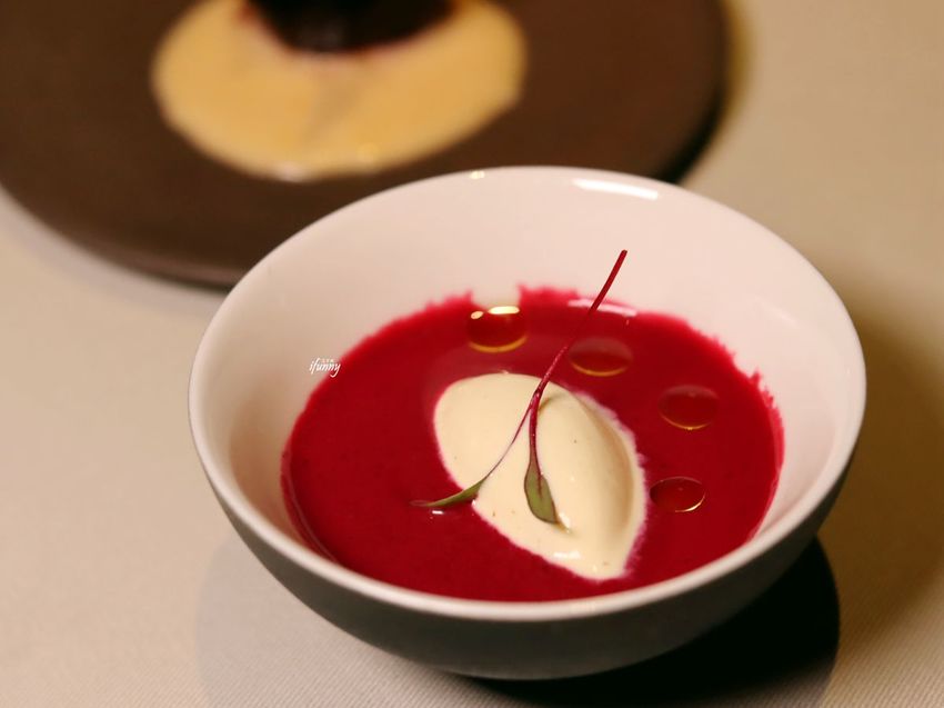一旁附上的是甜菜根製成的冷湯,中間是芥末籽製的冰淇淋。建議先吃甜菜根,再喝冷湯,就可以化解魚卵醬汁在口中的些許腥味。